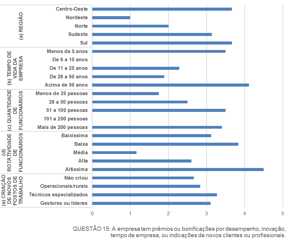 Na questão 15, que abordava prêmios e bonificações, a Figura 9 destaca com maior favorabilidade as empresas com mais de 50 funcionários, das regiões Sul e Centro-Oeste, seguidas pelo Sudeste. O Nordeste mostrou menor favorabilidade à questão. Entretanto, tanto as empresas mais novas no mercado quanto as mais antigas apresentaram maior favorabilidade, em contraste com as empresas de tempo médio de vida. Observou-se também que empresas com altíssima rotatividade em 2022, assim como aquelas com baixa e baixíssima rotatividade, demonstraram alta ou extremamente alta favorabilidade. Isso sugeriu que ações desse tipo nem sempre tinham um impacto significativo na rotatividade, indicando causas possivelmente provenientes de outras questões, como cultura e clima organizacional. Quanto à criação de postos de trabalho, houve uma tendência à neutralidade nas respostas.
