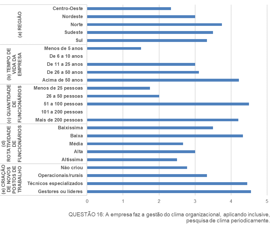 Sobre a questão 16, que tratava da gestão de clima e cultura organizacional, a Figura 10 sugere que as empresas mais favoráveis a essa afirmativa foram aquelas com maior quadro de funcionários (> 50 pessoas), com mais de 50 anos no mercado, que expandiram significativamente seu quadro com profissionais técnicos especializados e gestores/líderes, e que apresentaram baixa ou baixíssima rotatividade em 2022. Não se observou variação significativa entre as regiões, com exceção do Centro-Oeste, que apresentou baixa favorabilidade.