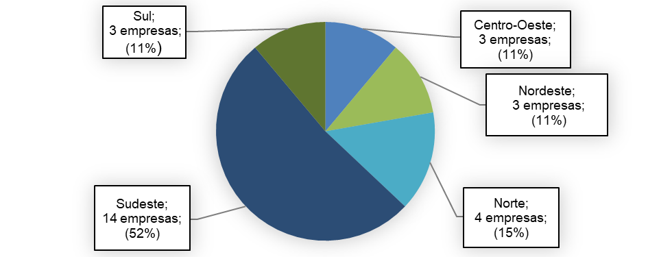 Das empresas convidadas, 27 responderam, abrangendo todas as regiões do Brasil. No entanto, houve um desequilíbrio significativo nas amostras coletadas, como evidenciado na Figura 1. Assim, a discussão dos resultados fundamentou-se em uma abordagem descritiva e gráfica, visando extrair conclusões sobre as características das empresas de agronegócio em relação ao atual cenário do turnover no campo, correlacionando tópicos de RH estratégico com os fatores dessa rotatividade.