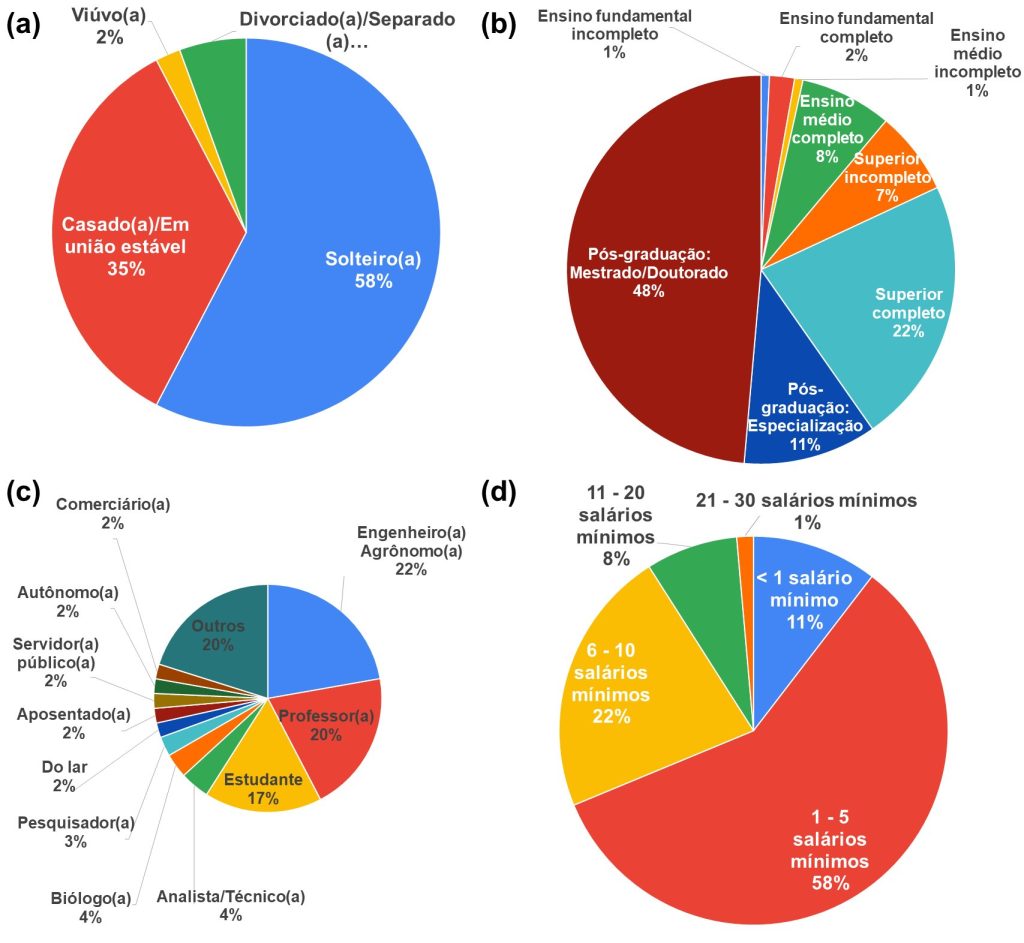 Informações sobre estado civil, escolaridade, profissão e renda familiar mensal (Figura 2) demonstraram que a maioria dos respondentes eram solteiros (58%); atuavam profissionalmente como engenheiros agrônomos (22%), professores (20%) e estudantes (17%); possuíam alto nível de escolaridade (pós-graduação, 48%); e recebiam salários entre 1–5 salários mínimos (58%). A complexidade associada à obtenção de respondentes em questionários on-line está relacionada à representatividade da amostra para evitar fraudes[19],[20]. Todavia, ressalta-se que 59% dos respondentes não atuavam nas profissões descritas acima (engenheiros agrônomos, professores e estudantes); 52% não possuíam pós-graduação; e 42% recebiam salários em faixas distintas de 1–5 salários mínimos (Figura 2).