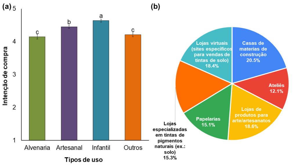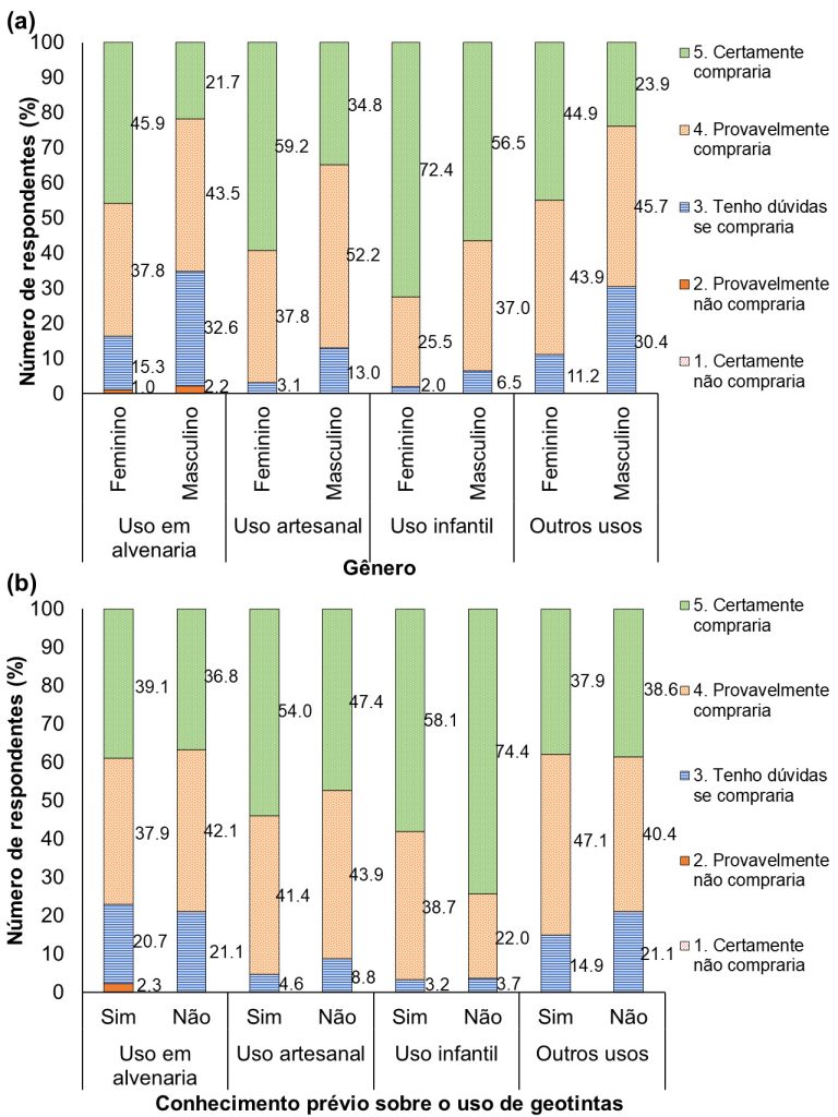 Quanto à intenção de compra, 99,3% dos respondentes teriam interesse em comprar geotintas caso elas estivessem à venda. No geral, obtiveram-se notas médias (n = 144) que variaram de 4,15 (± 0,06) a 4,67 (± 0,04), indicando alta intenção de compra para todos os tipos de uso, sendo que as geotintas mostraram maior aceitabilidade (p < 0,05) pelos consumidores para usos artesanal e infantil (Figura 3a). A pintura em alvenaria recebeu a menor (p < 0,05) intenção de compra (Figura 3a). Todavia, a nota “1. Certamente não compraria” não foi atribuída para nenhum dos tipos de uso.