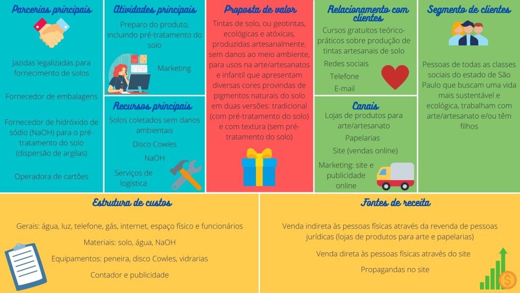 Com base nos resultados obtidos, desenvolveu-se um modelo de negócios Canvas (Figura 5). O modelo de negócios Canvas sugerido neste estudo levou em consideração as respostas dos questionários, a conservação do meio ambiente e a importância social da geotinta, focando a geração de renda de diversas comunidades rurais e a conscientização da importância da conservação do solo[6],[10],[11].