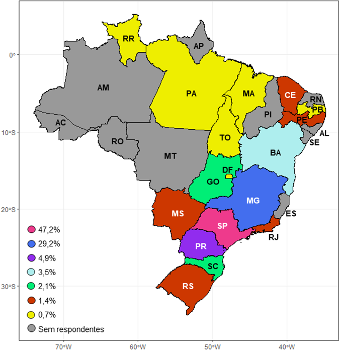 Esse estudo contou com 144 respondentes de 17 unidades federativas do Brasil, com representantes de todas as regiões brasileiras (Norte, Nordeste, Centro-Oeste, Sudeste e Sul), sendo que a região Norte apresentou o menor número de respondentes e a maioria das respostas foi da região Sudeste, com destaque para os estados de São Paulo e Minas Gerais (Figura 1).