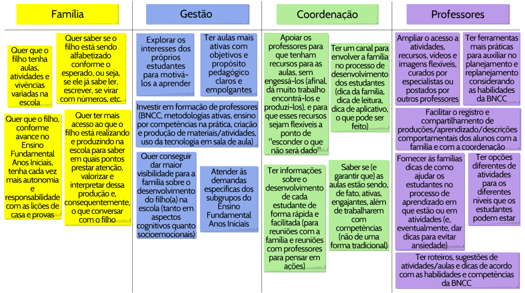 A segunda etapa, Observar, é quando são feitas idas a campo para conversar com os potenciais usuários e público-alvo, em um exercício de escuta e observação, buscando entender suas reais necessidades. Nesse momento, é importante analisar o contexto desse usuário de forma mais ampla, considerando aspectos físicos, culturais, sociológicos, psicológicos e comportamentais sob diferentes perspectivas[10]. Portanto, todos os membros da equipe multidisciplinar cumpriram com uma agenda de observação de aulas regulares de três escolas – já clientes – que manifestaram interesse em serem pilotos da plataforma (escolas-piloto). Além disso, as reuniões de planejamento dos professores do Ensino Fundamental Anos Iniciais também foram acompanhadas. Em razão do contexto da pandemia de COVID-19, a prática da observação foi realizada de forma on-line.