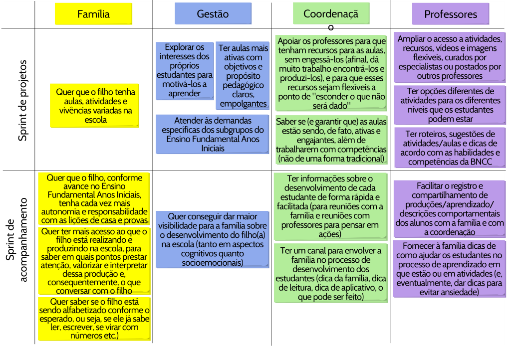 O sprint de conteúdo foi o momento para idealizar, prototipar e testar como o conteúdo escolar seria apresentado aos estudantes e professores ao longo do ano letivo, tanto no livro impresso como na plataforma digital. O objetivo traçado para a semana de trabalho foi “a empresa está trazendo um material didático mais atual, que vai funcionar com a minha turma, que me dará recursos práticos e com atividades interessantes para guardar no portfólio do aluno”, e a dinâmica buscou contemplar os requisitos dos usuários listados na Figura 1.