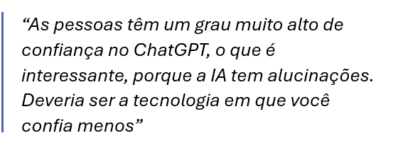 Grande parte das chamadas “alucinações” geradas por modelos ocorre justamente pela influência direta dos inputs no resultado. Sam Altman, CEO da OpenAI, afirmou recentemente: “As pessoas têm um grau muito alto de confiança no ChatGPT, o que é interessante, porque a IA tem alucinações. Deveria ser a tecnologia em que você confia menos.” A confiança excessiva, somada à baixa compreensão sobre o funcionamento dos modelos, aumenta o risco de erros estratégicos e decisões baseadas em respostas superficiais.