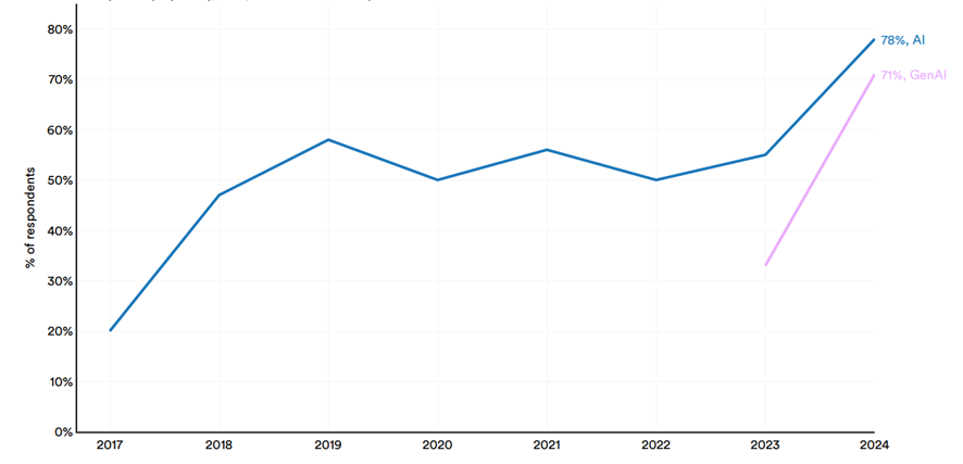 Esse avanço fica evidente no gráfico a seguir, que mostra que 78% das organizações já utilizam IA em pelo menos uma função, enquanto 71% adotaram soluções de IA generativa. O salto entre 2023 e 2024 evidencia a aceleração da adoção dessas tecnologias, que, além de automatizar processos, agora interagem de forma natural e criam.