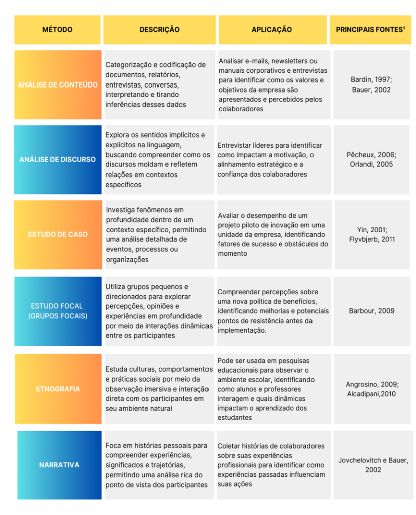 Para responder a questões como as abordadas, diferentes métodos qualitativos foram desenvolvidos e adaptados ao longo do tempo, cada um com suas particularidades e aplicações específicas. Essas abordagens oferecem metodologias com fundamento teórico, a fim de aplicar práticas voltadas à exploração de fenômenos complexos. Esses fenômenos, muitas vezes, estão relacionados a grupos específicos, ações, projetos ou indivíduos que são exclusivos de determinado contexto e momento. O quadro abaixo apresenta os principais métodos qualitativos e como eles podem ser aplicados tanto para entender a operação das organizações quanto para identificar soluções estratégicas baseadas em suas realidades.