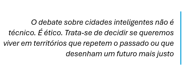 O debate sobre cidades inteligentes não é técnico. É ético. Trata-se de decidir se queremos viver em territórios que repetem o passado ou que desenham um futuro mais justo. Em “Morte e Vida de Grandes Cidades” (1961), Jane Jacobs destacou que as cidades têm a capacidade de oferecer algo a todos, mas apenas quando são criadas por todos.