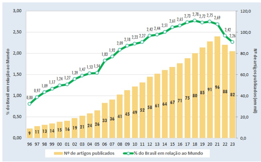 Segundo um relatório da editora Elsevier e da Agência Bori divulgado no primeiro semestre de 2024, o dispêndio público federal em pesquisa e desenvolvimento atingiu o ápice em 2012, quando o investimento atingiu R$ 50 milhões. Desde então observa-se uma queda acentuada nos números e, em 2022, o valor não ultrapassou R$ 35 milhões. Esse panorama impactou a publicação de artigos no Brasil. O gráfico abaixo mostra os Indicadores Nacionais de Ciência, Tecnologia e Inovação, com a quantidade de artigos brasileiros que foram indexados pela Scopus – maior base de dados mundial de resumos e citações de literatura revisada por pares – e o percentual em relação ao mundo entre 1996-2023.