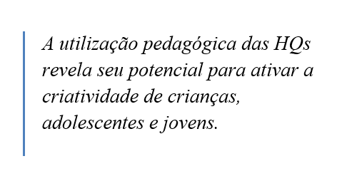 A utilização pedagógica das HQs revela seu potencial para ativar a criatividade de crianças, adolescentes e jovens. Com lápis e papel, é possível visitar galáxias distantes, explorar a estrutura do átomo, conhecer o interior do corpo humano, realizar jornadas pelos quatro cantos do mundo, reencontrar figuras históricas ou imaginar um mundo onde dinossauros voltam a caminhar entre nós.