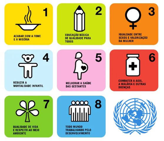 No ano de 2000, a Organização das Nações Unidas (ONU) estabeleceu 8 objetivos com 22 metas que visavam promover a dignidade humana e enfrentar, simultaneamente, a pobreza, a fome, as doenças, o analfabetismo, a degradação ambiental e a discriminação contra as mulheres até 2015. Aprovados pela Assembleia Geral, os Objetivos de Desenvolvimento do Milênio (ODM) foram adotados por 189 países e 23 organizações internacionais. A Figura 1 mostra esses objetivos.