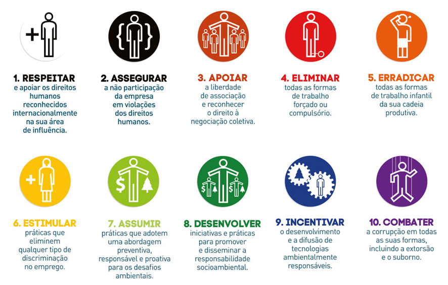 O Pacto Global estabeleceu dez princípios baseados em quatro documentos basilares: (1) a Declaração Universal de Direitos Humanos, (2) a Declaração da Organização Internacional do Trabalho sobre Princípios e Direitos Fundamentais no Trabalho, (3) a Declaração do Rio sobre Meio Ambiente e Desenvolvimento e (4) a Convenção das Nações Unidas Contra a Corrupção. As empresas deveriam: