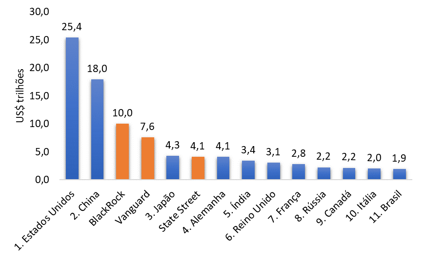 A Figura 4 apresenta em azul os 11 maiores PIBs do planeta, conforme relatório do Banco Mundial (2022). A eles foram acrescentados, em laranja, os valores dos fundos geridos pelas The Big Three. Sozinhas, elas ocupariam o terceiro, o quarto e o sexto lugares da lista. Somados, os fundos geridos por essas empresas comporiam o segundo lugar, superando o PIB (Produto Interno Bruto) da China.