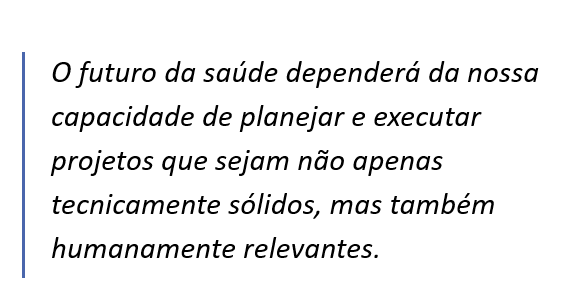 A grande reflexão que se coloca para gestores e profissionais é: até que ponto a gestão pode ser separada do cuidado? Cada vez que um novo fluxo de atendimento é criado, um protocolo clínico é estruturado ou uma tecnologia digital é adotada, estamos diante de um projeto. Reconhecer isso é fundamental para que a gestão de projetos não seja vista como algo externo, mas como parte integrante da prática assistencial. Talvez sua maior contribuição esteja em fomentar uma cultura colaborativa, em que diferentes atores trabalham juntos, com responsabilidade compartilhada e foco na melhoria contínua.