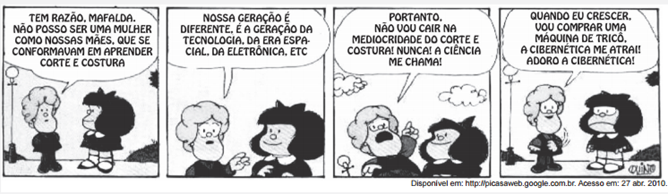 A tirinha da Mafalda, reproduzida em 2013 em umas das provas do Exame Nacional do Ensino Médio (ENEM), sobre o processo de modernização e as perspectivas de vida das mulheres no contexto profissional, ilustra a transição de valores e interesses que espelha a própria evolução da ciência e da tecnologia na sociedade.