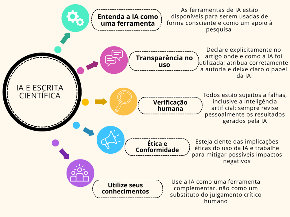 A escolha dessas ferramentas não deve ser meramente técnica; precisa ser embasada por teorias que possam contribuir para a produção do conhecimento de forma ética e respeitando as diretrizes de cada periódico (Rolim et al. 2023). As quebras de paradigmas epistemológicos a partir dos questionamentos que o ser humano vai construindo são positivas e, inclusive, auxiliam na composição das revoluções científicas, guiando a maneira como os estudos são concebidos (Kuhn, 1998). Mas a transformação pode e deve ser paulatina, para não causar danos ao equilíbrio de todo um sistema. A figura abaixo mostra dicas sobre a utilização ponderada da inteligência artificial, como ferramenta de auxílio na pesquisa.