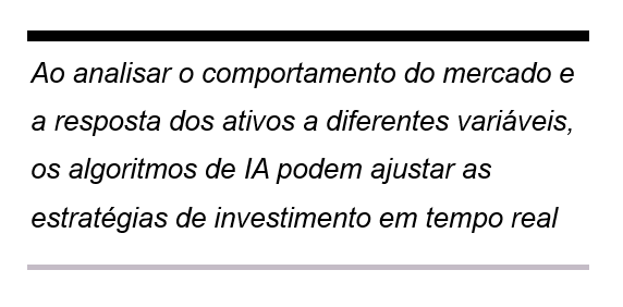 A IA também trouxe a possibilidade de personalizar estratégias financeiras conforme o perfil e os objetivos de cada investidor. Ao analisar o comportamento do mercado e a resposta dos ativos a diferentes variáveis, os algoritmos de IA podem ajustar as estratégias de investimento em tempo real, buscando otimizar o desempenho e gerenciar os riscos de forma personalizada. Dessa forma, tanto investidores individuais quanto grandes instituições conseguem utilizar modelos que considerem suas necessidades específicas, aumentando a precisão e eficiência das operações.
