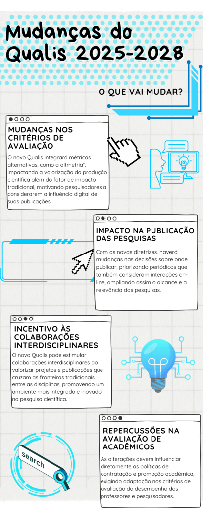 No entanto, conforme apresentado recentemente pela Revista Pesquisa Fapesp (2024), essa transição não vem sem desafios. Os periódicos precisarão enfrentar despesas adicionais e possíveis reestruturações, influenciando até mesmo na escolha de assuntos em alta de artigos para publicação, bem como aumentando a demanda de tempo para divulgação em massa dos artigos publicados, o que pode induzir os indicadores altimétricos a permanecerem elevados. Veja as principais mudanças implementadas com o novo Qualis no quadro ao lado.