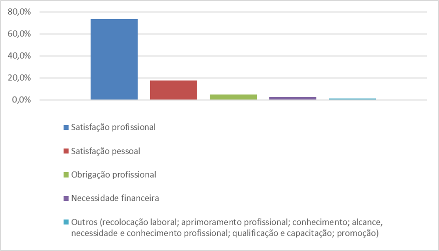 Do total de respondentes da amostra, 17,6% afirmaram buscar “satisfação pessoal”, e 5% alegaram “obrigatoriedade profissional”, resposta que foi a terceira mais citada. “Necessidade financeira” foi mencionada por 2,6% dos entrevistados e, em última posição, com 1,2%, ficaram os “outros motivos”, como, por exemplo, “recolocação no mercado”, “aprimoramento profissional”, “conhecimento”, “qualificação e capacitação”.