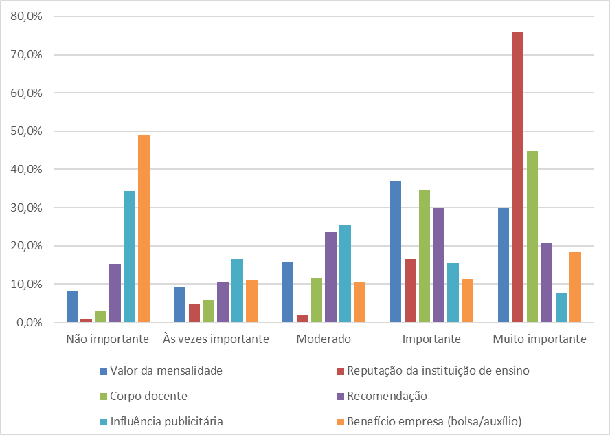 Entre as dificuldades encontradas pelos alunos durante a jornada do curso (Figura 4), chamou a atenção o fator considerado como “não importante”: a “conciliação financeira”. A percepção de “preço justo” e valor percebido em relação aos serviços prestados pela instituição mais uma vez aparece neste tópico. Apesar disso, esse item foi considerado “muito importante” por 13,7% dos pesquisados, dado que pode estar mais ligado à situação econômica do país durante o período estudado do que à situação financeira individual.