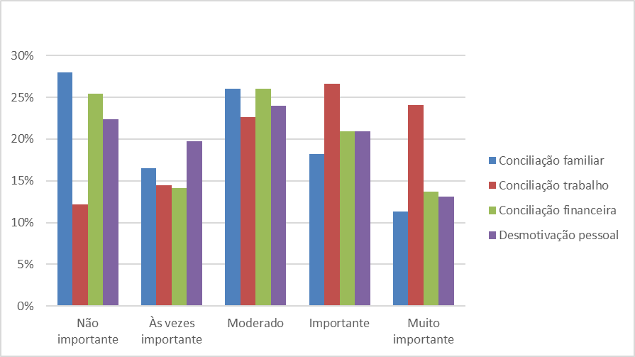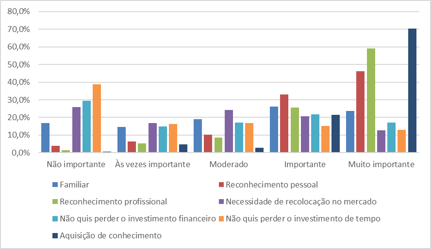 Como já havia sido constatado pelas repostas anteriores, a maioria afirmou que suas principais motivações orbitavam o campo profissional: novos cargos e/ou mais reconhecimento dentro dos locais de trabalho. Em seguida, em quantidade menor, os integrantes da amostra citaram a busca pelo conhecimento. Mais uma vez foi possível perceber a tendência autoafirmativa dos integrantes da amostra, uma vez que a obtenção de cargos e títulos se mostrou mais importante do que a obtenção de conhecimento.